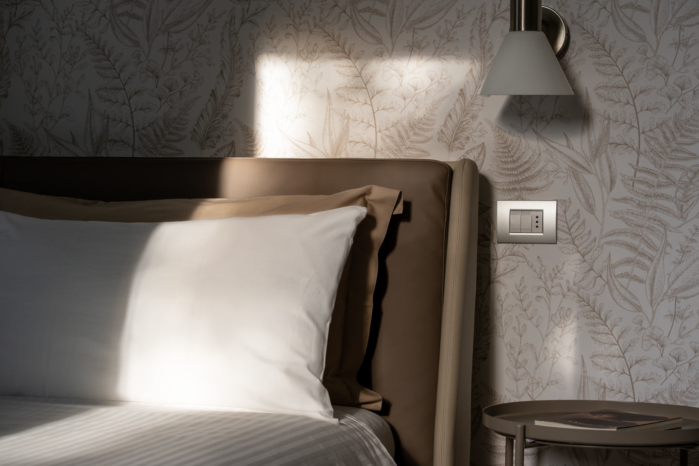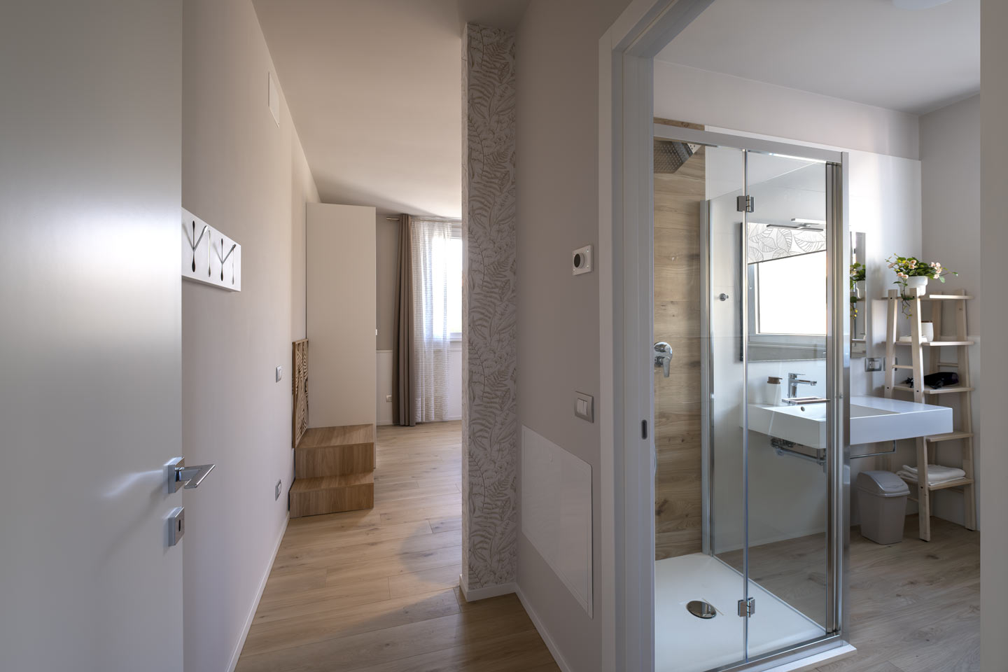 Il letto è un king size, la biancheria è soffice, le tende filtrano la luce al mattino. Ogni arredo è scelto con attenzione, per creare armonia senza rinunciare alla funzionalità.