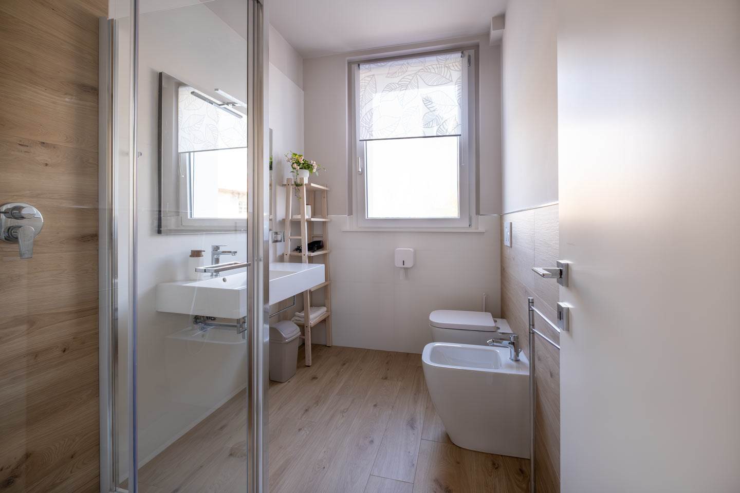 Una grande finestra illumina la stanza, la doccia è spaziosa, con soffione a pioggia.